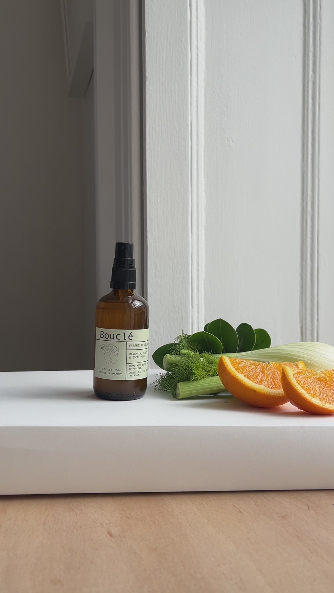 Revitalising eucalyptus is blended with sweet mandarin & aromatic fennel in this exclusive Bouclé room spray blend. Our luxury room mist is scented with essential oils derived from all natural ingredients meaning there are no synthetic scents.